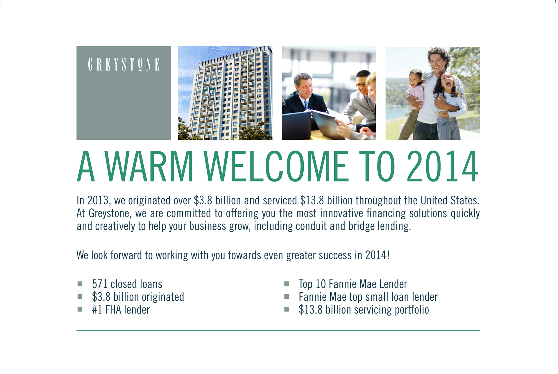 This was the first mailer piece sent out in 2014, announcing Greystone's achievements in 2013.