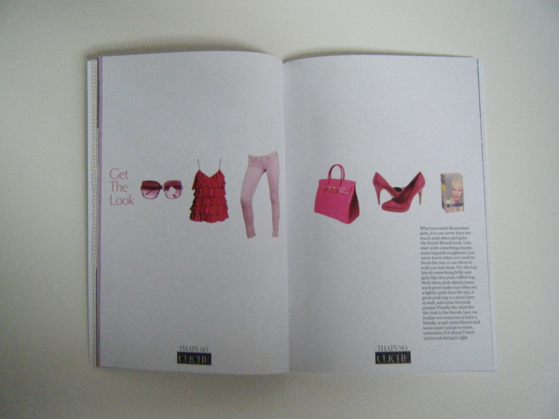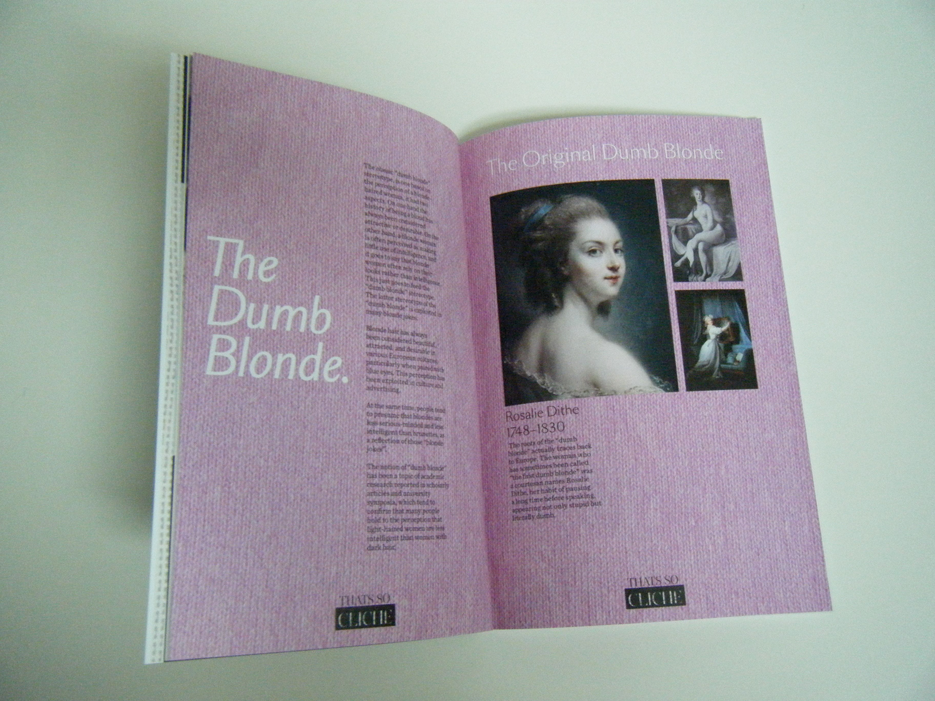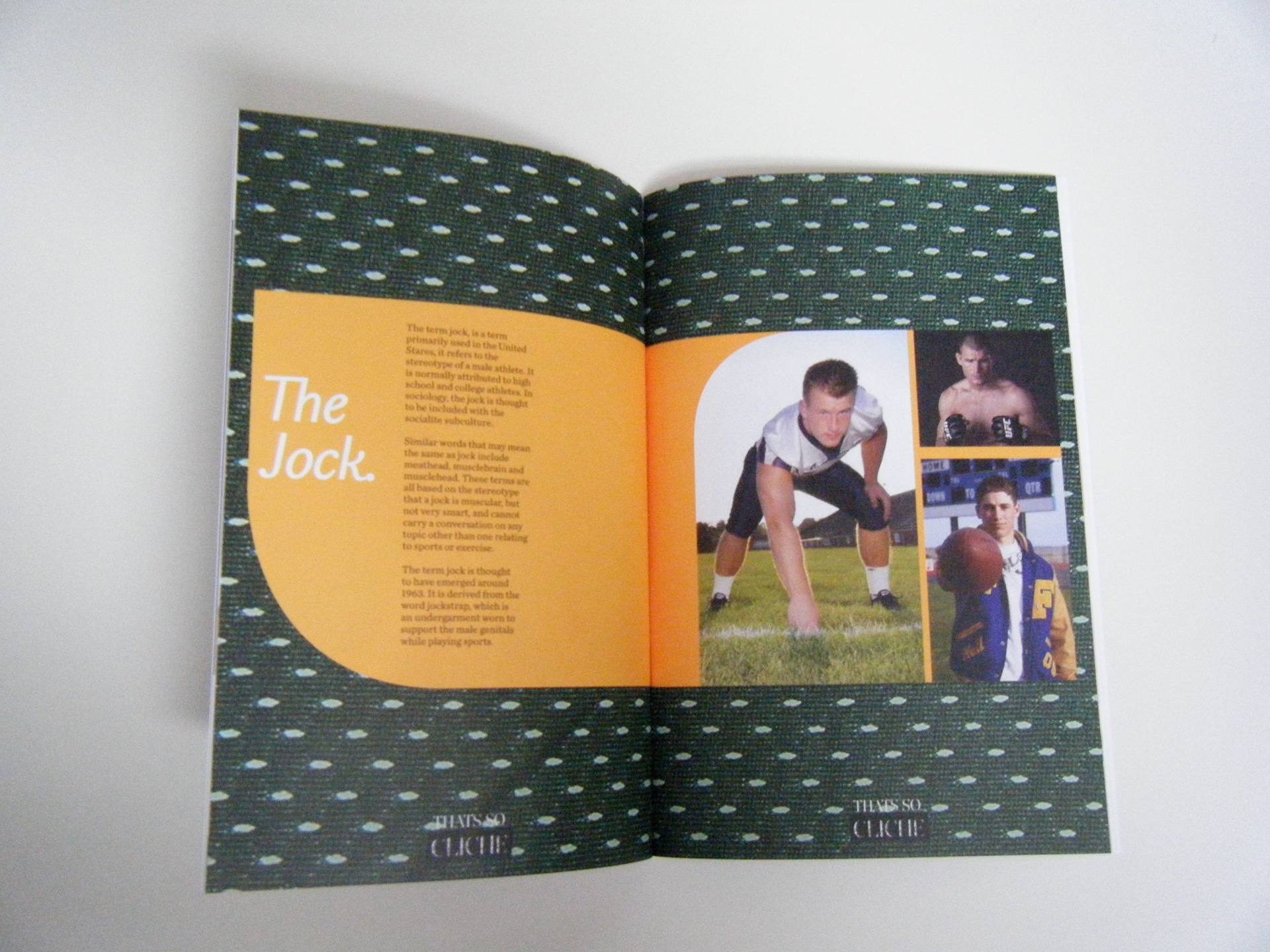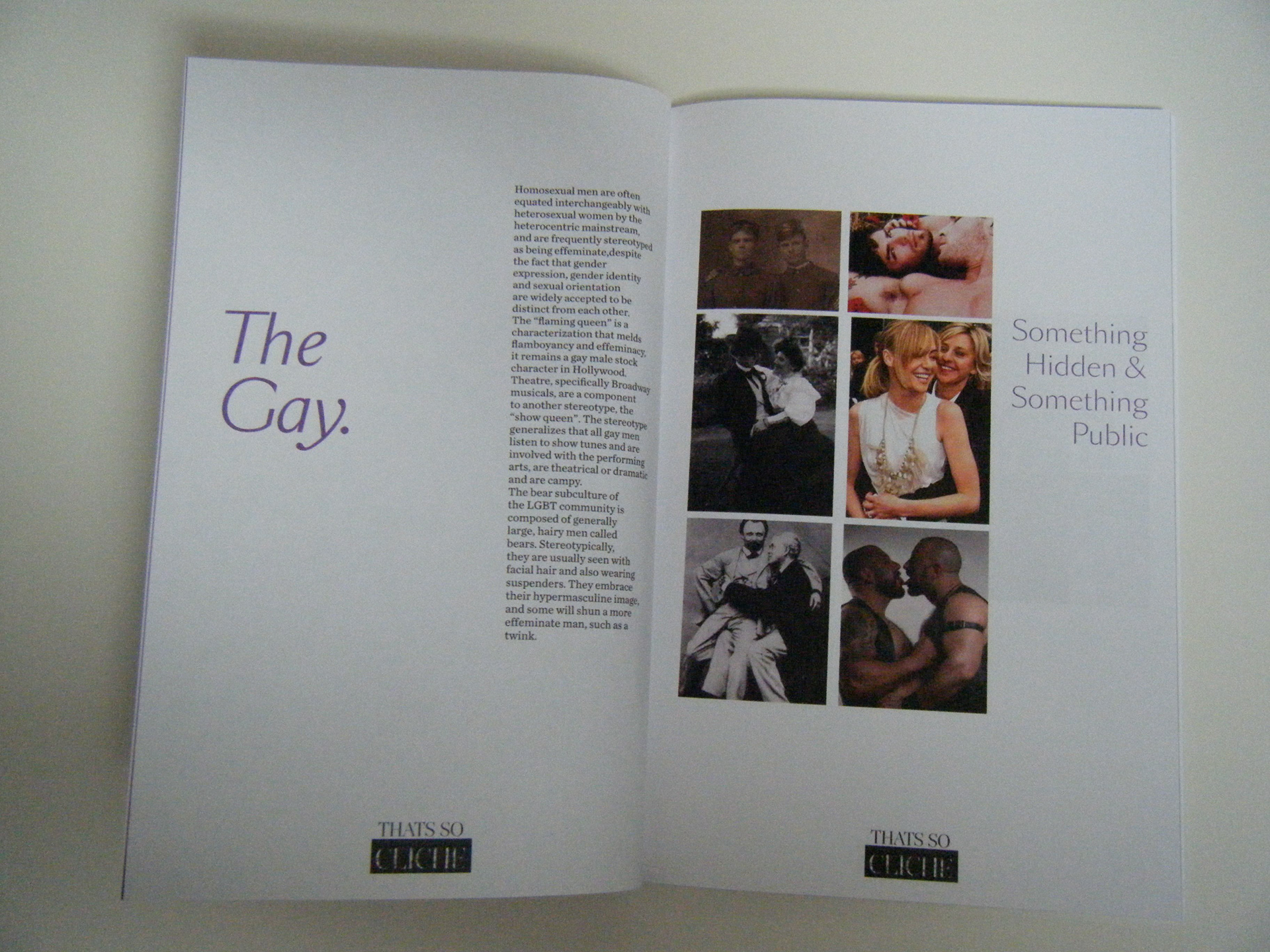 Senior Project, class of 2012 Fashion Institute of Technology. First you see the poster for the project, followed by the book cover and some spreads. The topic of this project was to break down stereotypes into something that is almost so exaggerated that it is hard to believe it is true.